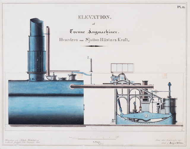 Handcolorierte Zeichnungen der "Tvenne Ångmachiner" von Daniel Fraser