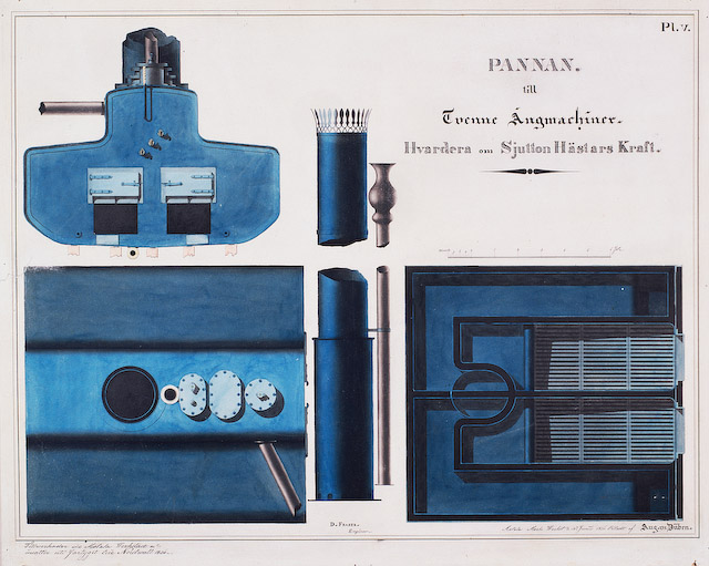Handcolorierte Zeichnungen der "Tvenne Ångmachiner" von Daniel Fraser